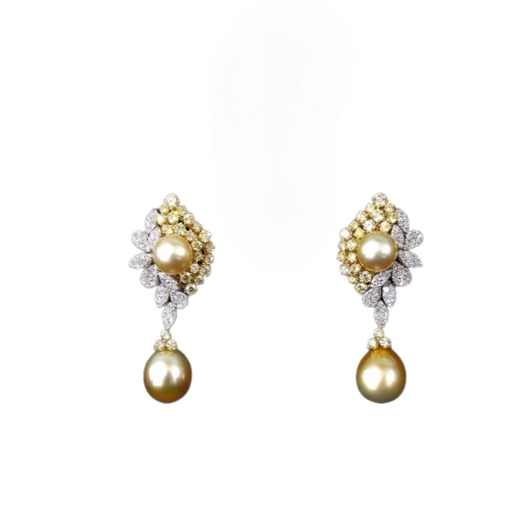 Diamond and Pearl Earrings Totaling 3.70 Carats of Yellow and White Diamonds Center and Drop Pearl 18k Gold Material