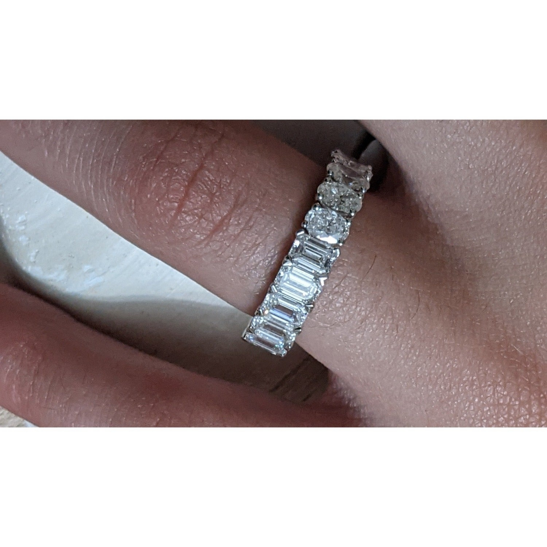 Wow! A breakthrough in diamond wedding bands.  That wedding band is comprised of 2 rings in 1. A half-circle of the band is masterfully set with Classic Emerald Cut Diamonds, and the other half side is set with beautiful Oval cut diamonds. Choice of Emerald classic look or fun luscious oval diamond look.